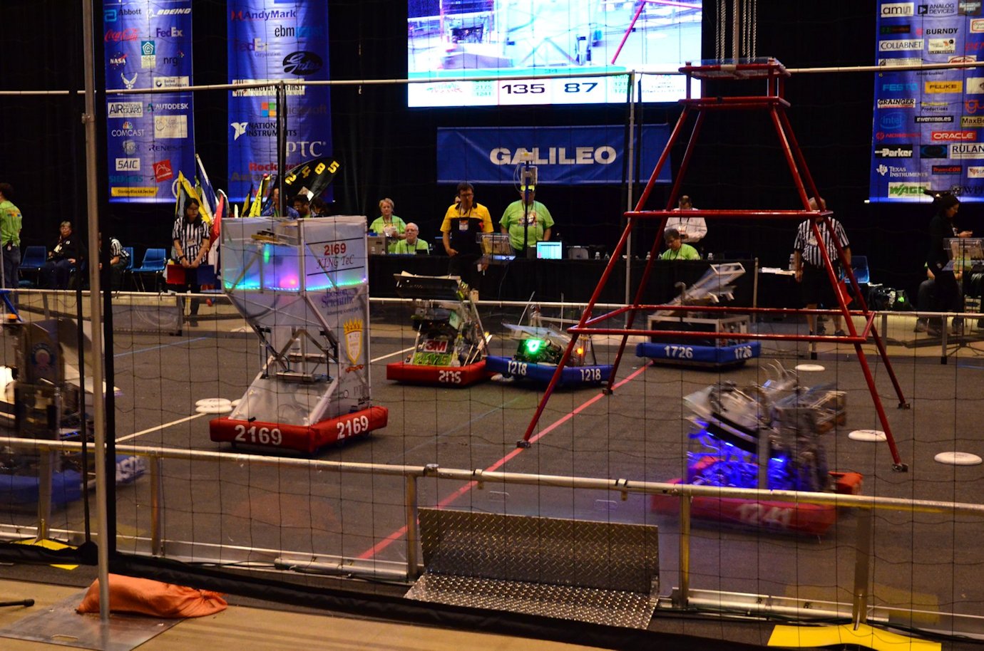 Robotics teams tried to instruct their robots to score as many flying discs into their goals as possible during two-minute and 15-second matches. Matches ended with robots attempting to climb up pyramids located near the middle of the field.